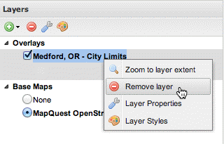 on the Layers panel toolbar. Alternatively, right-click the layer and click Remove Layer on the shortcut menu. Base Maps and Overlays layers may be removed in the same way.