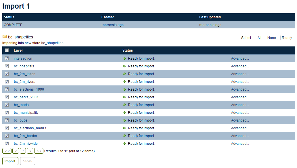 On the next page will be a list of layers found by the Layer Importer. The layers will be named according to the source content’s name (file name of database table name). For each entry there will be a Status showing if the source is ready to be imported.