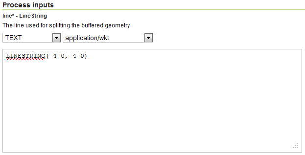 Input Value lineLINESTRING(-4 0, 4 0)geomLINESTRING(0 -1, 0 1)dist1Enter these values in the form, making sure to select sure to select TEXT and application/wkt as the source format for each input and output.