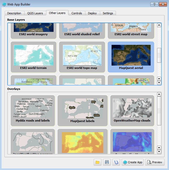 In the Other Layers tab, select the MapQuest aerial layer as the base layer to use. Leave all others unselected.