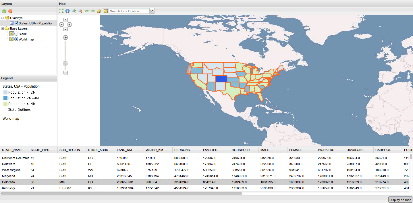 When the button Display on map is pressed, all the features are rendered client-side, and when walking through the grid the respective state is highlighted in the map: