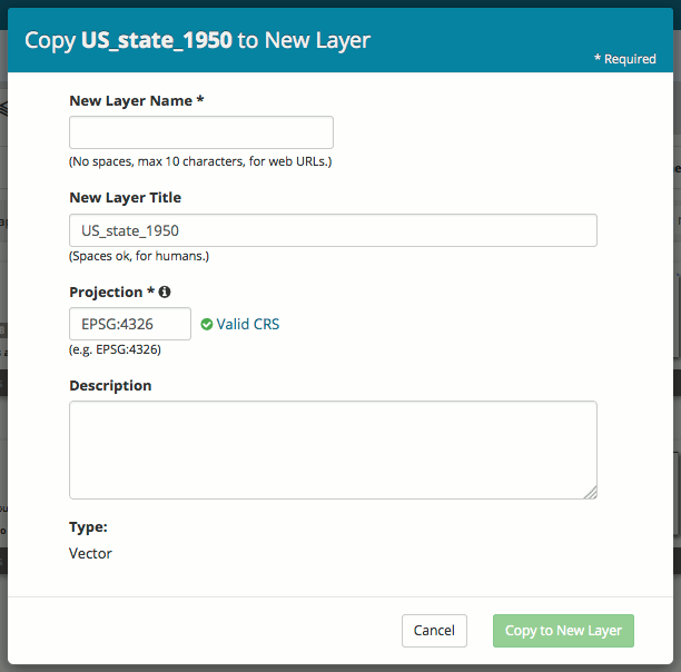 The Copy link brings up a very similar dialog to the Layer Settings, used to publish a copy of the layer as a new layer in GeoServer.