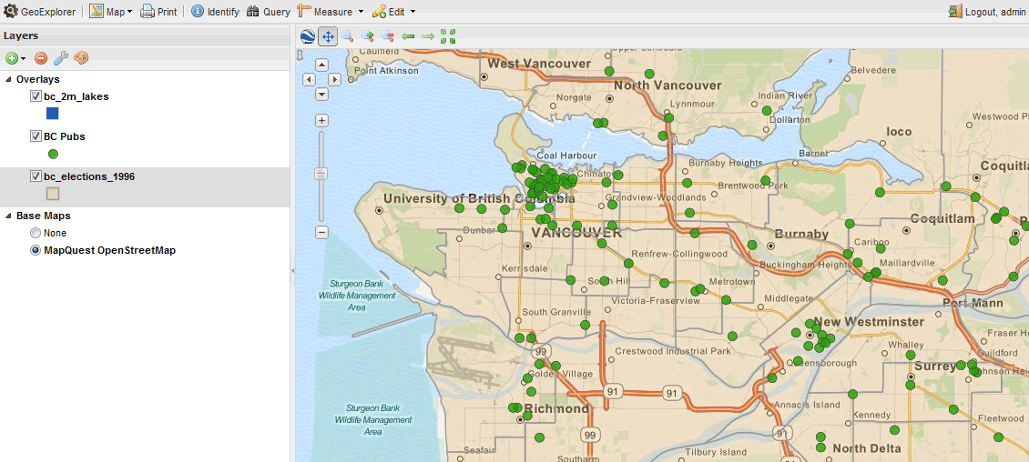 With your layers styled and edited, you are at last ready to compose and publish your map. Map composition involves loading all the layers you wish to publish, determining layer order, and determining map extent and positioning. Once this is accomplished, you can save your map in a format that makes it easy to embed in any web page.